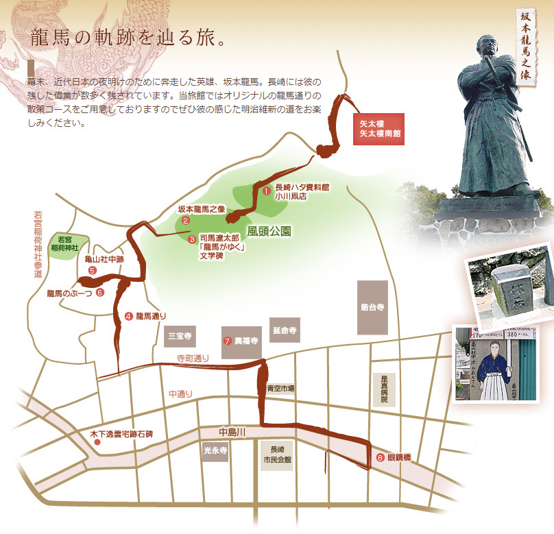 老朽化した建物を当時の建物に限りなく近い形に改修・復元し、「長崎市亀山社中記念館」として平成21年8月にオープンしました。名誉館長は、坂本龍馬に造詣が深い武田鉄矢氏が務めています。 龍馬のブーツなどのレプリカや、書状 ...