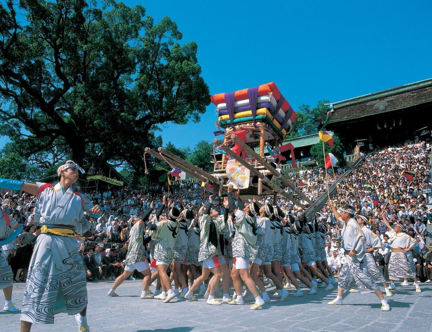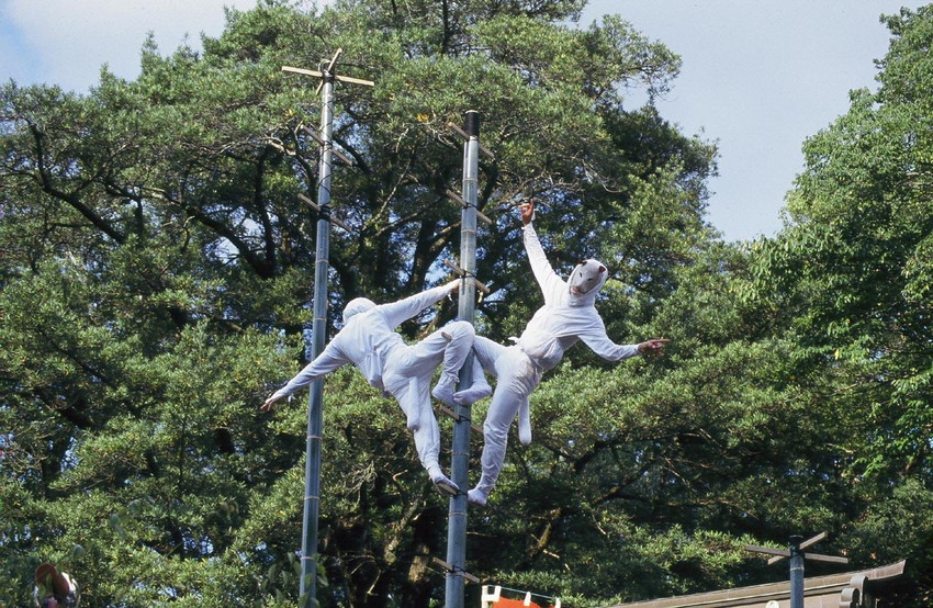 又、 秋の祭りに奉納される行事で、男狐・女狐の面をつけた2人の若者が、高さ10m余りの2本の青竹の上で曲芸 (竹ン芸)を行います。